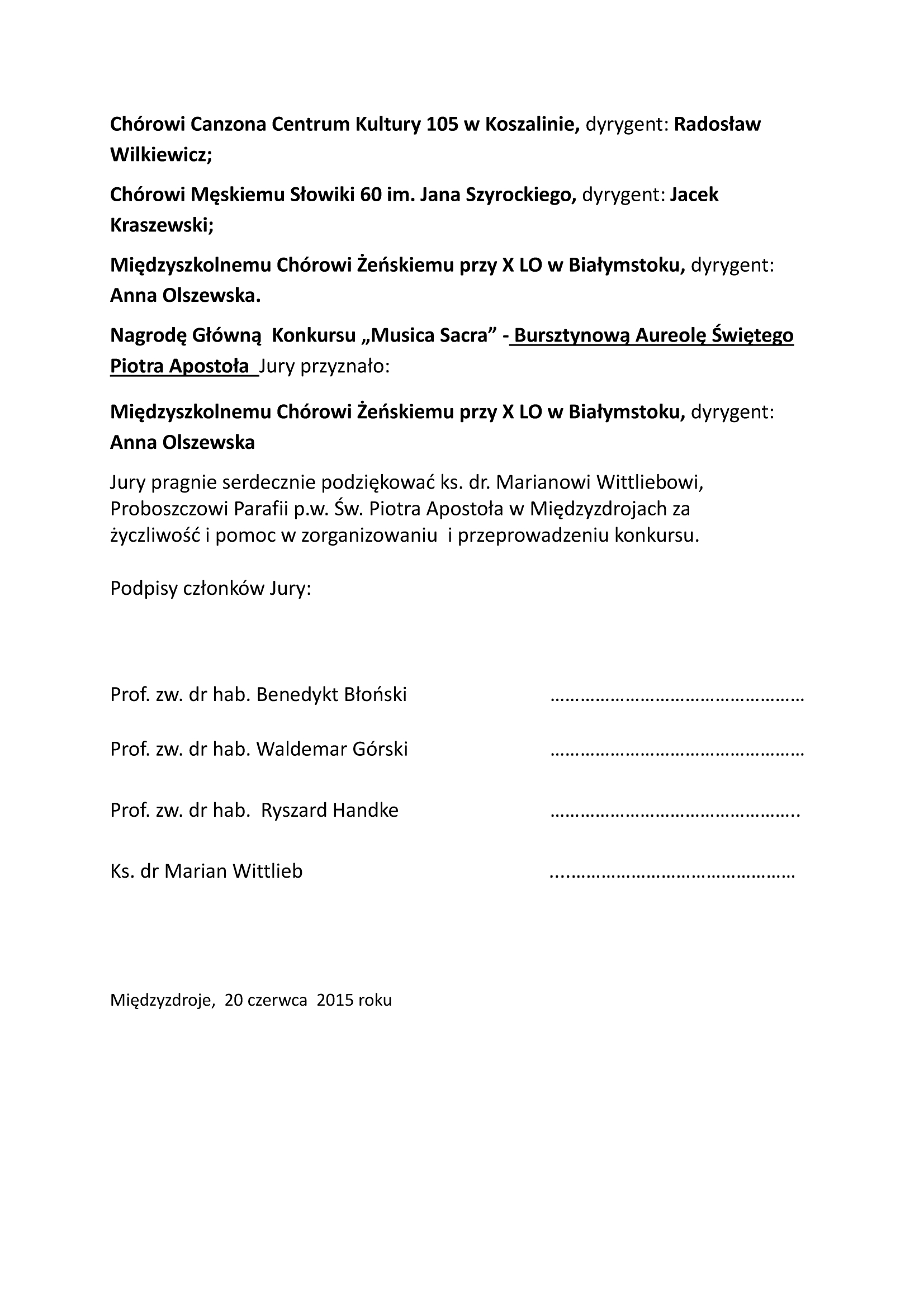 Protokół Jury Konkursu Musica Sacra 50MFPCH w Międzyzdrojach